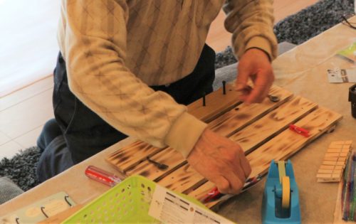 今回も講師役の千葉が木材をカット・塗装・焼き付けなどして「白木・チャコール色・焼き板」の3種類の板を準備してくれました。お好みの色の板を選んだら、まずは出来上がりの形をイメージして板を並べてみましょう。