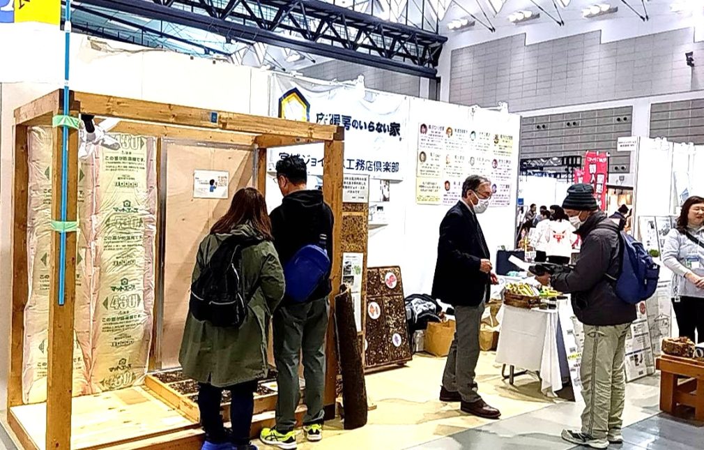 ジョイ・コス宮城工務店倶楽部のブースでは、実物大の炭化コルクの断熱パネルの展示と、古民家のリノベーション工事の様子をスライドショーで紹介し、ご覧いただきました。珍しい炭化コルクの断熱パネルに興味を持ったたくさんの方に足を止めていただけました。